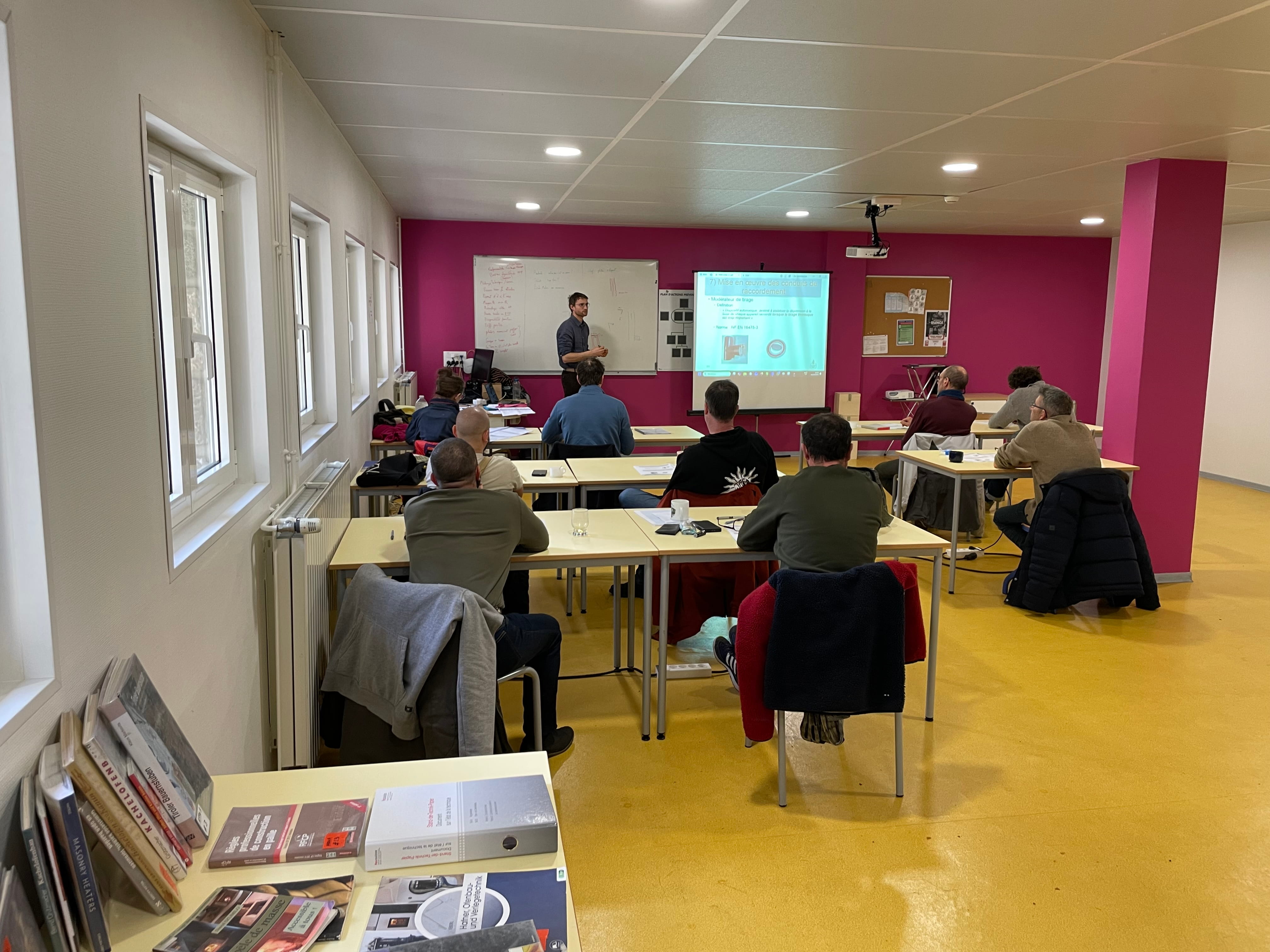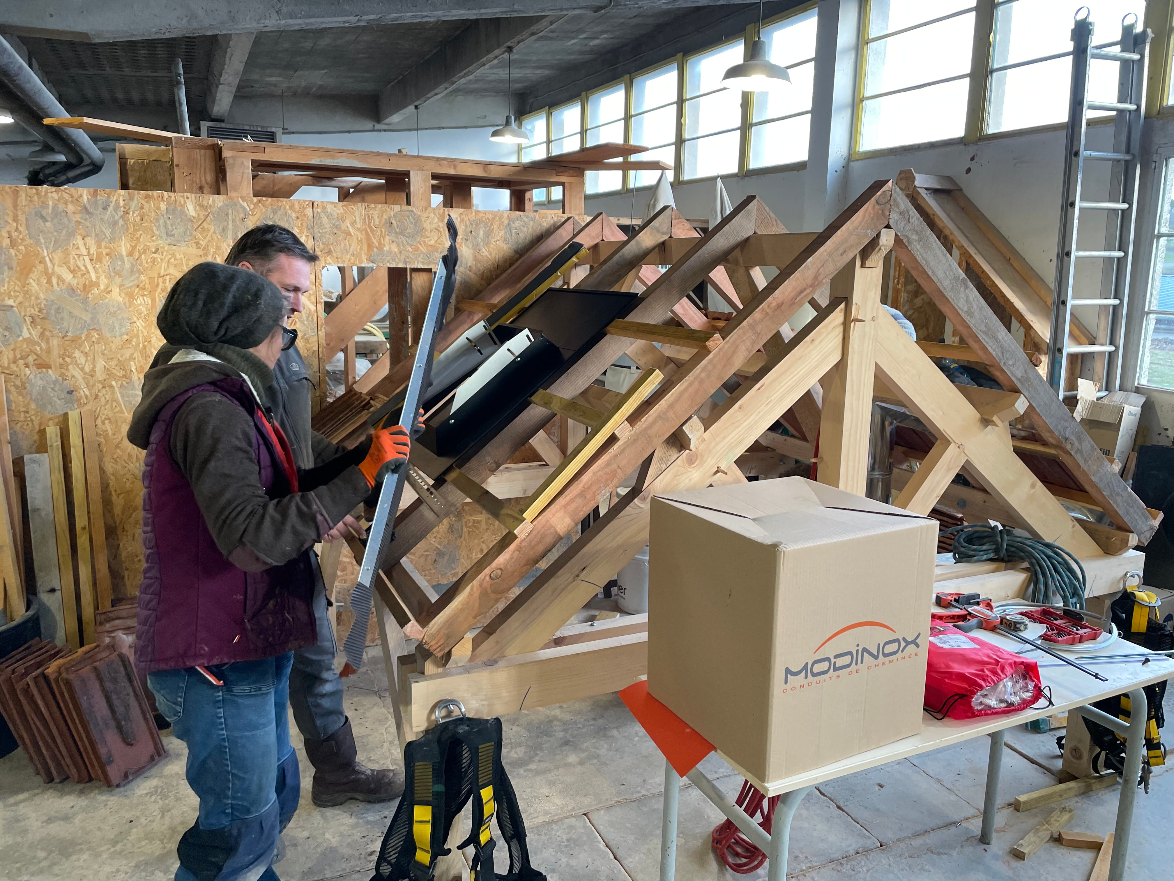 Les apprenants ont alterné en salle avec la théorie, puis en atelier avec la pratique. La réglementation était au cœur de l’apprentissage. En effet, les objectifs étaient d’acquérir les connaissance en terme de réglementation en fumisterie (DTU 24.1 / DT 24.2), de monter un conduit de fumée, de réaliser une sortie de toiture, de réhabiliter un conduit de fumée, de réaliser une arrivée d’air, de raccorder le poêle au conduit de fumée, ou encore de réaliser un coffrage ventilé…