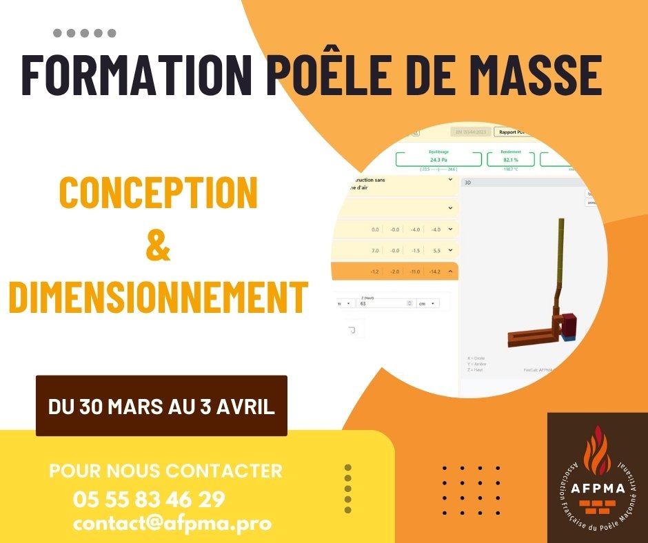 L’AFPMA et le GRETA du Limousin proposent un module de formation, unique en France, au Lycée des Métiers du Bâtiment, afin d’apprendre à concevoir et dimensionner des poêles maçonnés en respectant les normes NF EN 15544 (norme concernant le mode constructif autrichien) et NF EN 13384-1 (sur les conduits de fumée) par le calcul et l’utilisation du logiciel FireCalc. Cette session a un programme différent avec plus de temps sur la conception et de dimensionnement de poêle de masse.